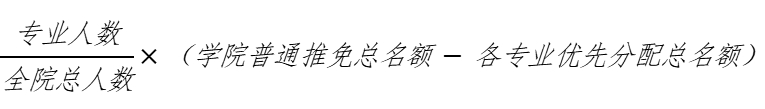 普通推免名额按照专业方向进行分配。根据公司当年发布的名额分配方案,先按学科、专业建设发展情况分配优先名额,再将剩余名额按各专业方向的有学籍在校人数比例根据实际情况进行分配,计算公式如下: