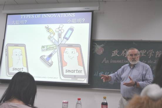 “学者气质,朴素严谨”是听课同学对于Suttmeier教授最多的评价,叙事清晰,轻松幽默的授课气氛让同学们感受到了一场别开生面的“学术外教课”。Suttmeier教授就定义、思考、内容、方式、文化五个方面讲授了“创新”的内涵,最后结合全球化趋势,提出了自己对于当下创新制度建设所面临的问题和挑战的思考。