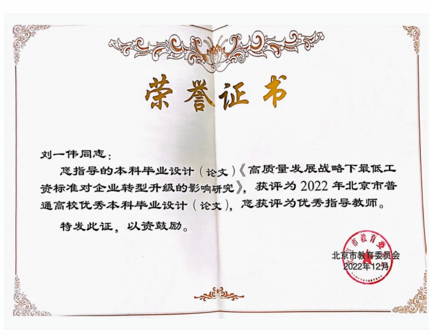 2022年11月3日,北京市教育委员会发布关于公布2022年北京市普通高等公司优秀本科生毕业设计(论文)名单的通知,公司刘一伟老师指导的本科毕业设计(论文)《高质量发展战略下最低工资标准对企业转型升级的影响研究》获评为2022年北京市普通高校优秀本科毕业设计(论文),刘一伟老师获评为优秀指导教师。