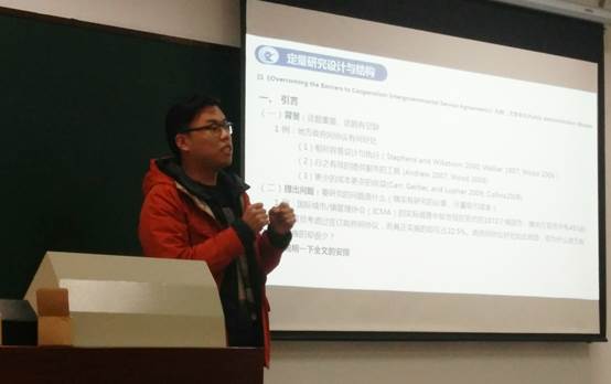 邢普耀学长以一篇论文具体介绍了论文写作中定量方法的运用。他认为一篇好论文的选题应该是重要且有创新的,在此基础之上才能继续选择相应的研究方法。定量研究要求规范化,在文献与理论上要形成一个科学的框架,进而做出假设,通过具体模型进行检验,并提出对策建议。由于很多同学对定量研究了解有限,邢普耀学长专门为大家介绍了一系列定量方法的书籍,帮助同学们熟悉定量研究的基本方法体系。