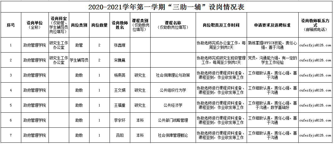 yl永利集团官网登录2020-2021学年第一学期“三助一辅”设岗情况表