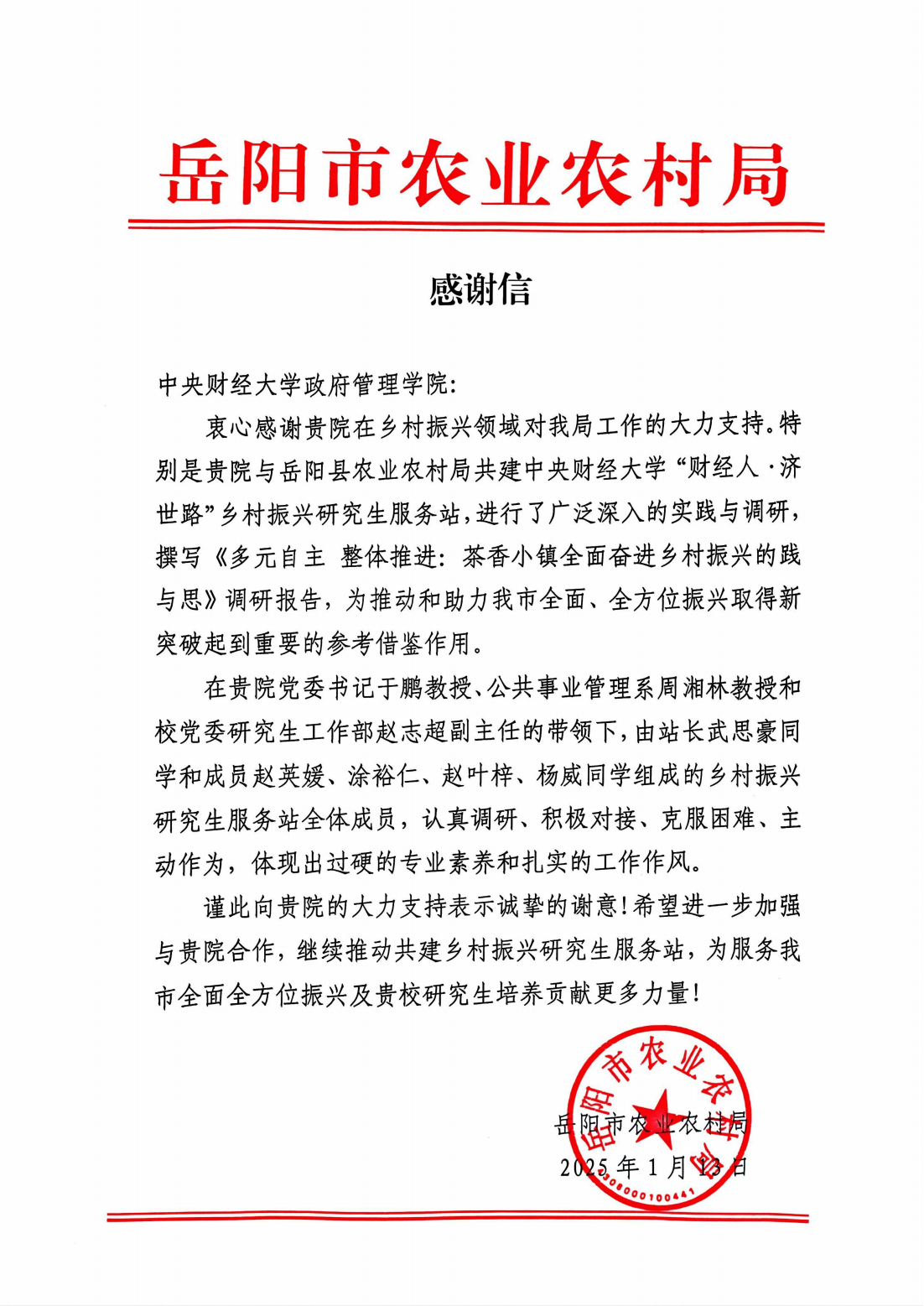 来信表示,在永利集团官网党委书记于鹏教授、公共事业管理系周湘林教授和公司党委研究生工作部赵志超副主任的带领下,由站长武思豪同学和成员赵英媛、涂裕仁、赵叶梓、杨威同学组成的乡村振兴研究生服务站全体成员,认真调研、积极对接、克服困难、主动作为,体现出过硬的专业素养和扎实的工作作风。实践团队在调研工作中所作出的积极努力为推动和助力岳阳市全面、全方位振兴取得新突破发挥了重要作用。