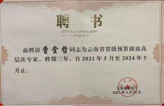 近日,在云南省财政厅举行的高层次预算绩效管理专家聘书颁发仪式上,公司曹堂哲教授受聘成为云南省高层次预算绩效管理专家,聘期三年。