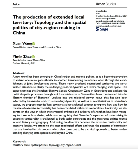 近日,公司城市管理系王璇老师以第一作者身份在城市研究国际权威期刊Urban Studies(中财AAA类)发表学术论文“The production of extended local territory: Topology and the spatial politics of city-region making in China”。该论文的合作者是英国杜伦大学的赵益民副教授,论文的在线链接如下:https://journals.sagepub.com/doi/10.1177/00420980241270959。