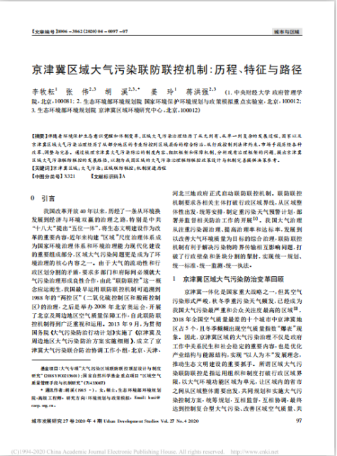 近日,公司研究生李牧耘在《城市发展研究》2020年第4期发表学术论文,题目为《京津冀区域大气污染联防联控机制:历程、特征与路径》。