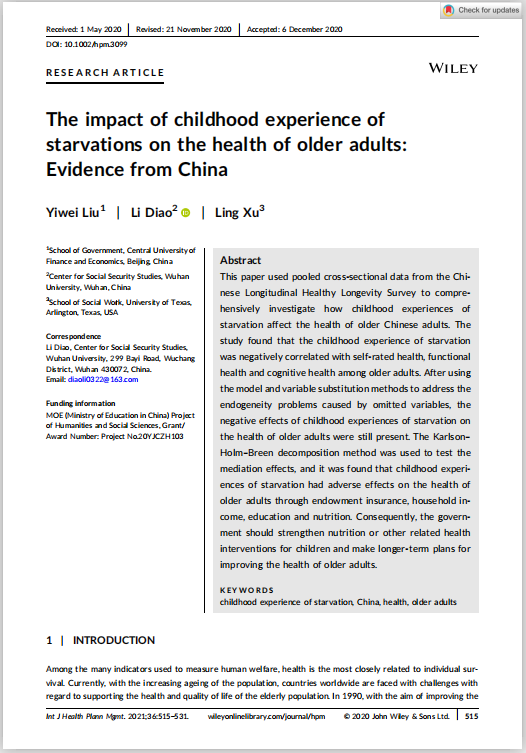 近日,公司公共事业管理系刘一伟博士在International Journal of Health Planning and Management 36卷第2期(https://doi.org/10.1002/hpm.3099)发表学术论文,题目为The impact of childhood experience of starvations on the health of older adults: Evidence from China.