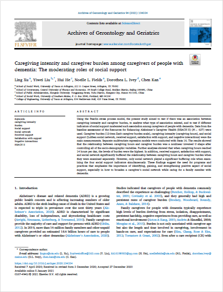 近日,公司公共事业管理系刘一伟博士以通讯作者在Archives of Gerontology and Geriatrics发表学术论文,题目为Caregiving intensity and caregiver burden among caregivers of people with dementia: The moderating roles of social support.