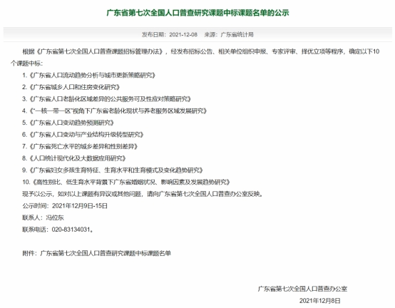 2021年12月8日,广东省第七次全国人口普查办公室发布了《广东省第七次人口普查研究课题中标课题名单的公示》文件。公司黄志基副教授团队申报的课题《广东省人口流动趋势分析与城市更新策略研究》经过专家评审、择优立项等程序,最终顺利中标。此次课题中标是公司落实产学研融合、服务国家和地方重大需求的新突破,为公司在广东省人口治理、城市更新等领域的研究夯实基础。