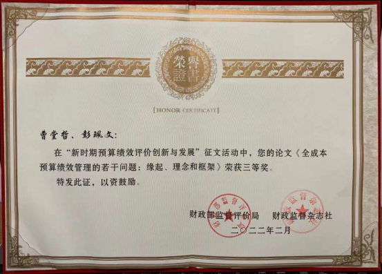 2022年2月,yl永利集团官网登录行政管理系曹堂哲教授和2018级行政管理专业本科生彭珮文同学合作撰写的论文《全成本预算绩效管理的若干问题:缘起、理念和框架》获得财政部监督评价局与《财政监督》杂志社联合举办的“新时期预算绩效评价创新与发展”征文三等奖。