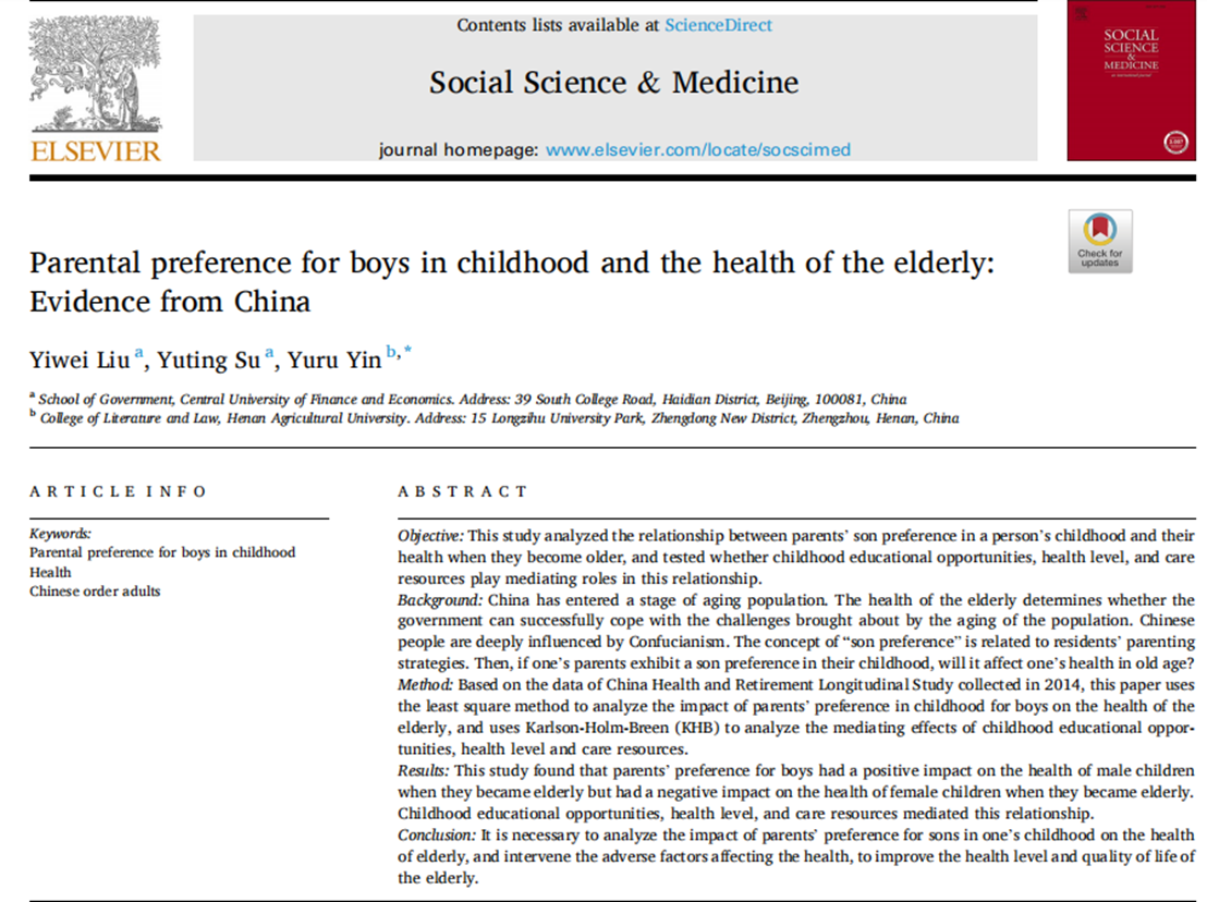 近日,yl永利集团官网登录刘一伟博士的学术论文Parental preference for boys in childhood and the health of the elderly: Evidence from China正式发表于Social Science & Medicine(五年IF=5.299,JCR分区:Q1)2022年第302卷(https://doi.org/10.1016/j.socscimed.2022.114986)。Social Science & Medicine是社会科学领域的国际著名期刊,也是公司AAA类期刊。
