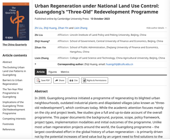 近日,以yl永利集团官网登录黄志基副教授为通讯作者的学术论文“Urban Regeneration under National Land Use Control: Guangdong's ‘Three-Old’ Redevelopment Programme”在区域与中国研究国际权威期刊The China Quarterly(中财AAA类)在线发表。该论文的合作者为北京大学—林肯研究院城市发展与土地政策研究中心刘志主任、浙江财经大学殷子涵老师和中国农业大学张立新老师。论文在线链接如下:https://doi.org/10.1017/S0305741023001455。