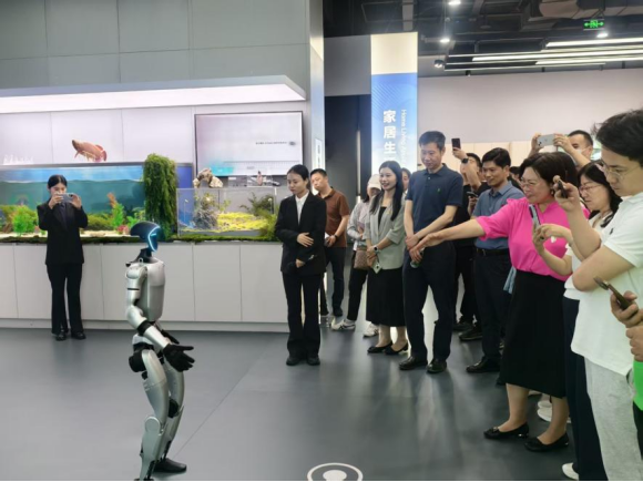 展示中心的布局别具一格,涵盖工业制造、医养结合、仿生动物、家居生活、遥感操作等多种应用场景,彰显科技与生活的深度融合。在工业制造展厅,智能协作机械臂精准模拟汽车零部件装配流程,淋漓尽致地展现出柔性生产线巨大的升级潜力。服务型机器人展厅同样精彩纷呈:医疗手术机器人精准模拟外科操作,智能药盒分拣机器人高效完成药品管理;憨态可掬的机器狗、熊猫机器人以及具备情感交互功能的小型人形机器人更是与师生们亲切互动,引得大家纷纷拿出手机拍照留念。
