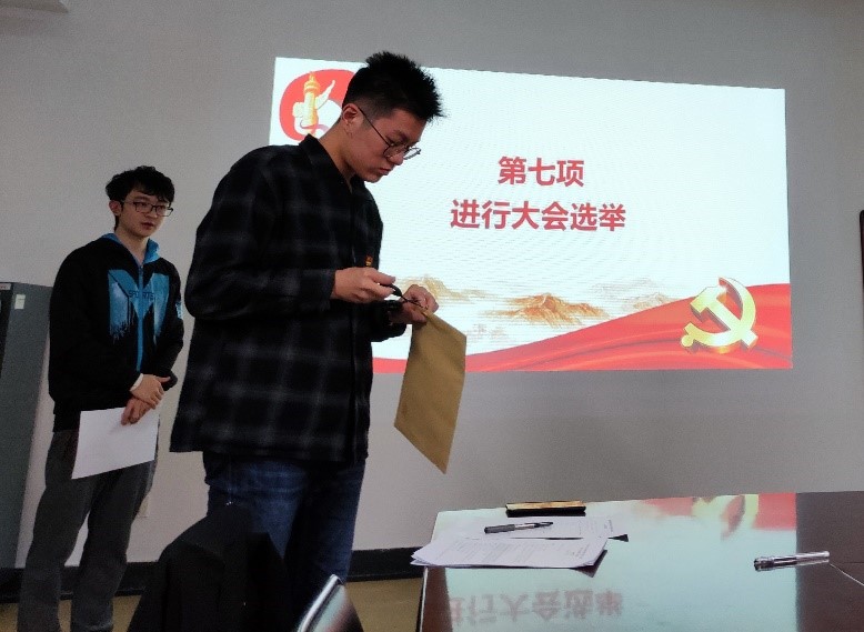 由总监票人张栋同志主持选举yl永利集团官网登录本科生党支部新一届委员会委员。本次选举发放选票8张,有效选票8张,李莎莉同志获赞成票7票,陈建军同志获赞成票7票,严其姝同志获赞成票4票,王文昊同志获赞成票6票。大会选举李莎莉、陈建军、王文昊三位同志为支部委员,选举结果有效。