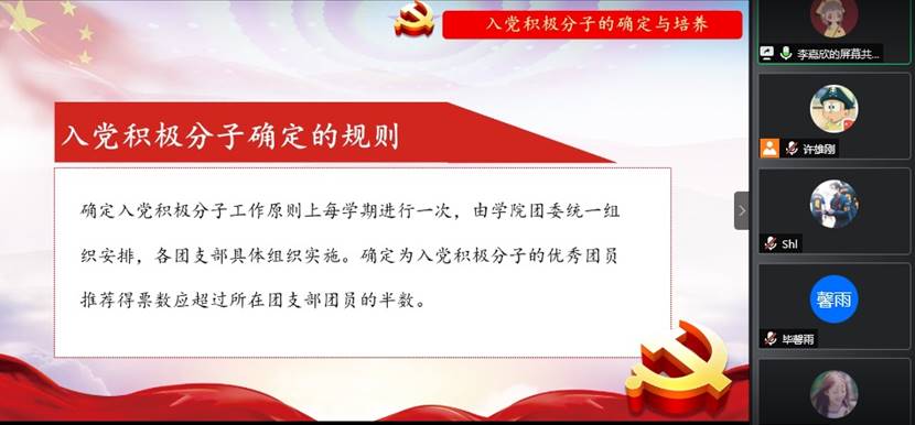 在入党流程介绍环节,支部组织委员李嘉欣按照时间顺序将入党流程划分为四部分进行讲解。首先是入党积极分子的确定及培养,这部分主要介绍了入党积极分子确定的标准、流程、规则以及入党积极分子确定后的培养。其次是发展对象的确定与培养,其中包括发展对象的确定标准以及发展对象确定后的考察和培养。第三部分主要是预备党员的审批与接收,最后是预备党员的管理考察和转正。
