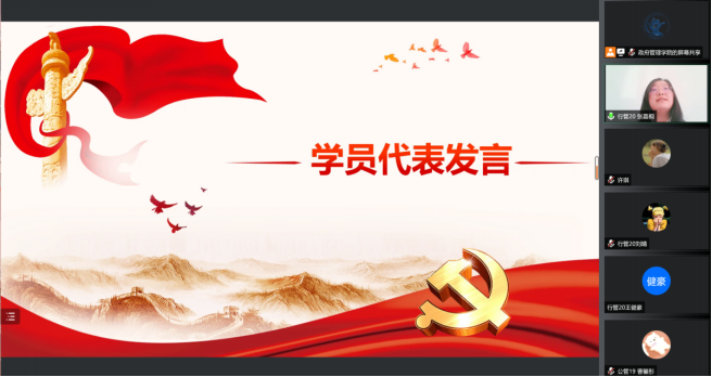 随后,学员代表张嘉桐同学发言。张嘉桐同学首先回顾了党的百年历程中,党领导人民奋斗的峥嵘岁月和光辉业绩。接着结合抗击新冠疫情的斗争,感悟党组织表现出的强大思想引领力、群众组织力、社会号召力和广泛深远的世界影响力。张嘉桐同学表示在感动的同时更加热切希望加入中国共产党的队伍,自己将珍惜此次宝贵的党校培训机会,以党员的标准严格要求自己,将理论知识与实践相结合,提高思想觉悟,争取早日成长为一名合格的新时代老员工党员,在充满责任感与使命感的组织中贡献属于自己的一份力量。