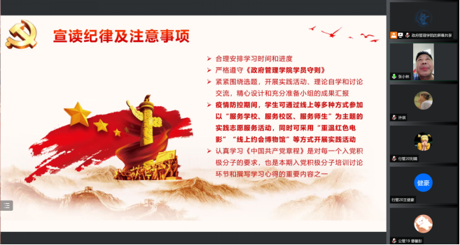 2022年5月13日,yl永利集团官网登录2022学年第一期入党积极分子培训班开班仪式暨党课第一讲于腾讯会议线上举行,公司党委副书记、党校副董事长李宇环副教授,公司党委组织员南琪老师,公司员工工作办公室主任、党校办公室主任张小林老师,以及来自教师、本、硕、博四个群体的45名入党积极分子参加了本次开班仪式。开班仪式由武思豪同志主持。