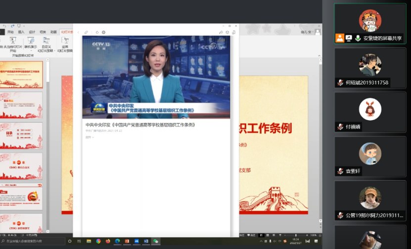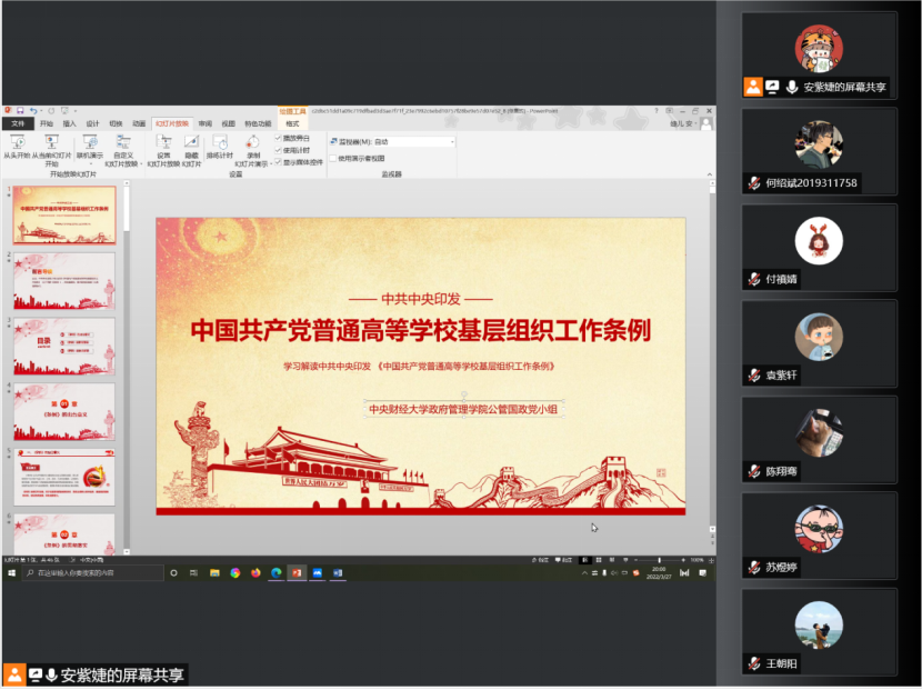 2022327日晚,yl永利集团官网登录本科生党支部公管国政小组通过腾讯会议的方式,在线上开展关于《中国共产党普通高等公司基层组织工作条例》(以下简称《条例》)专题学习会议,会议由安紫婕同志主持。