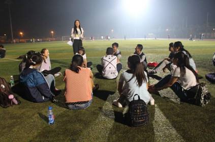 此次活动分为“相识飞飞飞”、“风儿吹吹吹”、“比划猜猜猜”三个环节。在找到各自分组、领取名牌后,每组同学首先进行了自我介绍。一片欢呼声中,第一个环节启动,分小组进行了两个游戏。通过“相识飞飞飞”、“风儿吹吹吹”这两个游戏,大家很快记住了同学们的名字,气氛愈加融洽。在众人期待之下,“比划猜猜猜”游戏开始了。绿茵场上,照明灯下,投影着同学们手舞足蹈的妙曼身姿,洋溢着青春的笑语。所谓破冰,便是在这一点点的交流中,融化横亘在同学们之间的冰,让距离感不复存在。接下来,第二个环节开始,由带队学长学姐抽取惩罚项目。在他们的表演过程中精彩瞬间频频上演:四大壮男演绎别样小天鹅;学长带头,齐跳《小苹果》,顿时嗨翻全场;儿歌《小星星》与《爸爸去哪儿》的混搭萌出新花样,尽显同学们最本质的稚嫩童真之心。最后人体拼写的“CUFE”将中财印在了操场那片嫩绿之上,更融在了每一位15级新生的心里。