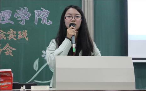 首先,作为校级一等奖获得者,行管15张筱祎同学分享了“如何选题”的经验。她认为选题要深入实际,贴近生活,具有实际意义,并且选题的操作性要强,她从身边的热点话题下手,选取北京动物园服装批发市场搬迁为自己的研究内容,深入地探讨了服装批发市场搬迁的利弊,并将自己所思所想写到了实践报告中。