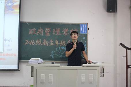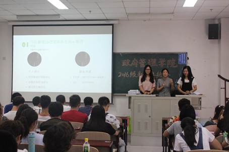 随后,宁钰皓老师为同学们介绍三名芮+导师,她们分别是担任国政16芮+导师的杨丹艺(注税14)、行管16芮+导师的杨晓(金实14)、公管16芮+导师的张芳(管会14)。在分别进行了自我介绍之后,三名芮+导师也传达了因事未至的公管16芮+导师张笑竹(投资14)对同学们的问候,在对芮+工作事宜进行了简单介绍之后,三名芮+导师进行了校团委与校员工会招新的宣讲,她们通过生动的PPT为新生们展示了各部门招新的情况,并鼓励新生们勇敢进行尝试,主动把握丰富多采的老员工活。