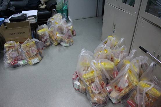 晚上七点半,宁老师和杨崇祺将各类零食分别装入准备好的袋子中,包括小面包、小饼干等,二十五个袋子分堆地摆放在办公室中,代表了公司对献血同学们的鼓励赞扬和关心爱护。八点半,宁老师、阙老师与杨崇祺学长分别提起装满慰问品的袋子,往员工宿舍楼走去。