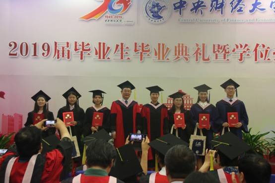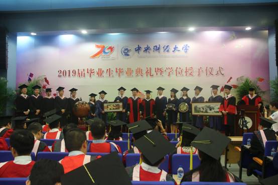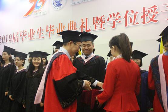 典礼进行第七项,学位授予仪式。在庄严而令人激动的乐曲声中,赵景华经理为2019届毕业生颁发毕业证书和学位证书,拨正流苏,握手并合影留念。深深鞠躬,感恩您谆谆教导;流苏拨正,愿你前路一片坦荡。