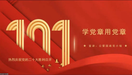 最后,是由李佳旭学长为学员们带来“学党章,用党章”的主题宣讲。他分别介绍了党章修正案、党章发展历程以及该如何学习和遵守党章。党章是党的总章程,对坚持党的全面领导、推进全面从严治党、加强党的建设具有根本性的规范和指导作用,学习和遵守党章要从以下“最核心、最根本、最关键、最实质”四个方面入手。党章是全党必须遵循的总规矩,全党全国各族人民必将在以习近平同志为核心的党中央坚强领导下,团结一心,众志成城,砥砺奋进,开拓创新,引领承载着中华民族伟大复兴的巨轮胜利驶向光辉的彼岸。