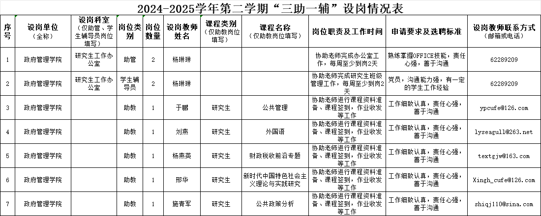 yl永利集团官网登录2024-2025学年第二学期“三助一辅”设岗情况表