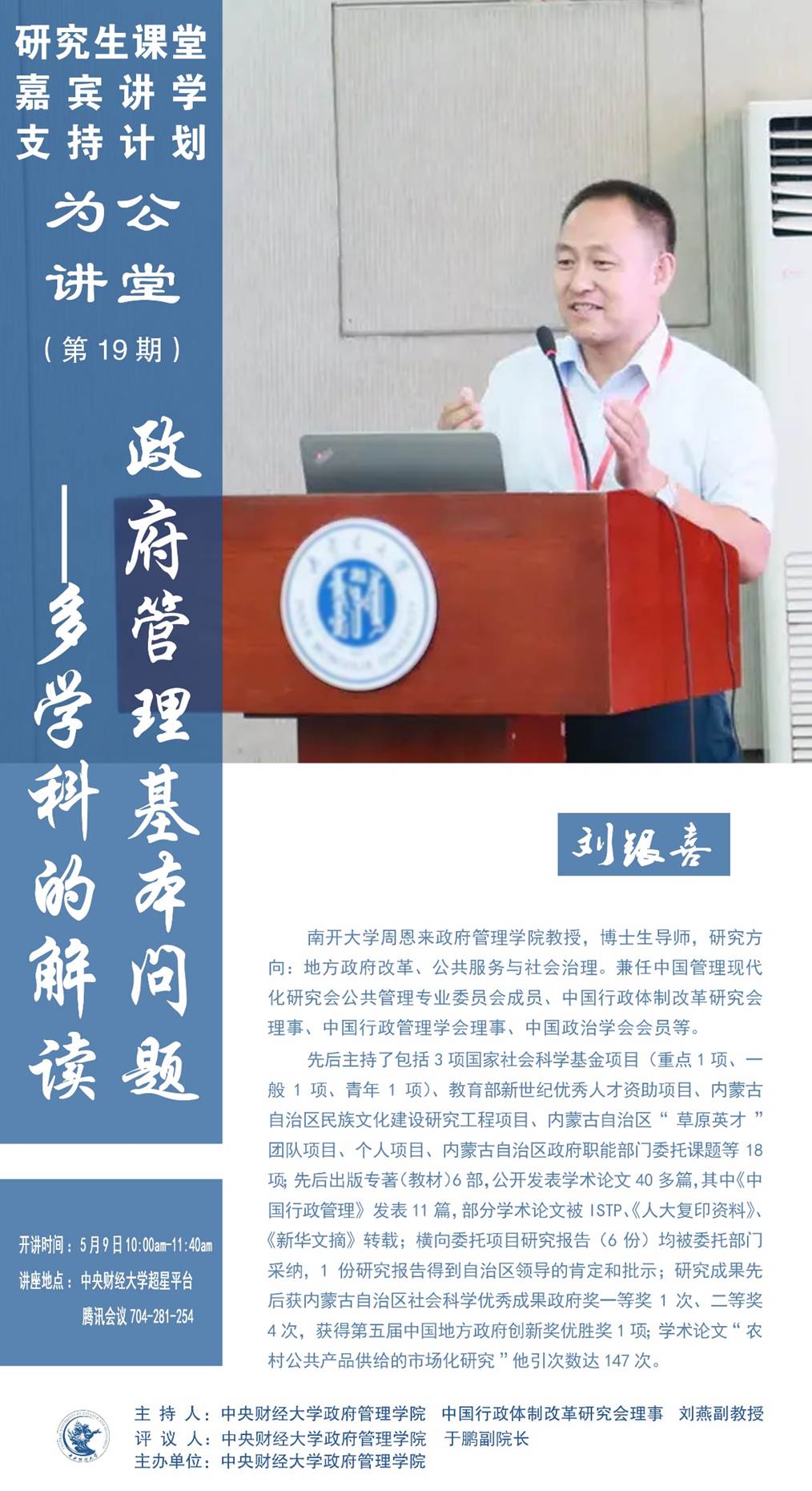 嘉宾简介:刘银喜,南开大学周恩来yl永利集团官网登录教授,博士生导师。研究方向:地方政府改革、公共服务与社会治理。兼任中国管理现代化研究会公共管理专业委员会成员、中国行政体制改革研究会理事、中国行政管理学会理事、中国政治学会会员等。先后主持了包括3项国家社会科学基金项目(重点1项、一般1项、青年1项)、教育部新世纪优秀人才资助项目、内蒙古自治区民族文化建设研究工程项目、内蒙古自治区“草原英才”团队项目、个人项目、内蒙古自治区政府职能部门委托课题等18项;先后出版专著(教材)6部,公开发表学术论文40多篇,其中《中国行政管理》发表11篇,部分学术论文被ISTP、《人大复印资料》、《新华文摘》转载;横向委托项目研究报告(6份)均被委托部门采纳,1份研究报告得到自治区领导的肯定和批示;研究成果先后获内蒙古自治区社会科学优秀成果政府奖一等奖1次、二等奖4次,获得第五届中国地方政府创新奖优胜奖1项;学术论文“农村公共产品供给的市场化研究”他引次数达147次。