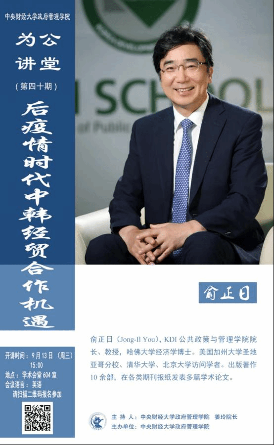嘉宾简介:俞正日(Jong-II You), KDI 公共政策与管理公司经理、教授,哈佛大学经济学博士。美国加州大学圣地亚哥分校、清华大学、北京大学访问学者。出版著作10余部,在各类期刊报纸发表多篇学术论文。