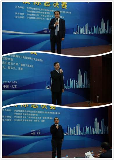 大赛的最后,三位评委对队伍的表现进行了现场点评。纪丰伟评委指出了大赛的三大亮点:第一,选题新颖并贴近实际;第二,“市长”选手们涉猎的知识涉及公共管理学、行政管理学、法学和法社会学,广博全面;第三,“市长”选手们谈到的很多社会问题都结合了党的十九大和认真学习贯彻了习近平新时代中国特色社会主义思想,反映出当代老员工的时代风貌。田中俊评委肯定了员工市长的研究主题,认为这些问题接地气,符合实际,都是社会热点问题,对当前的社会现实有较强的指导意义,同时田市长指出“员工市长”们进行了深刻的调研,响应了中央对干部的要求,他对新一代“市长”们给予深厚期望。屈新评委表达了他在本次大赛中的感受和收获,并衷心祝愿模拟市长大赛能够越办越好。
