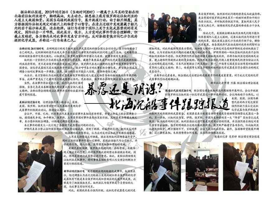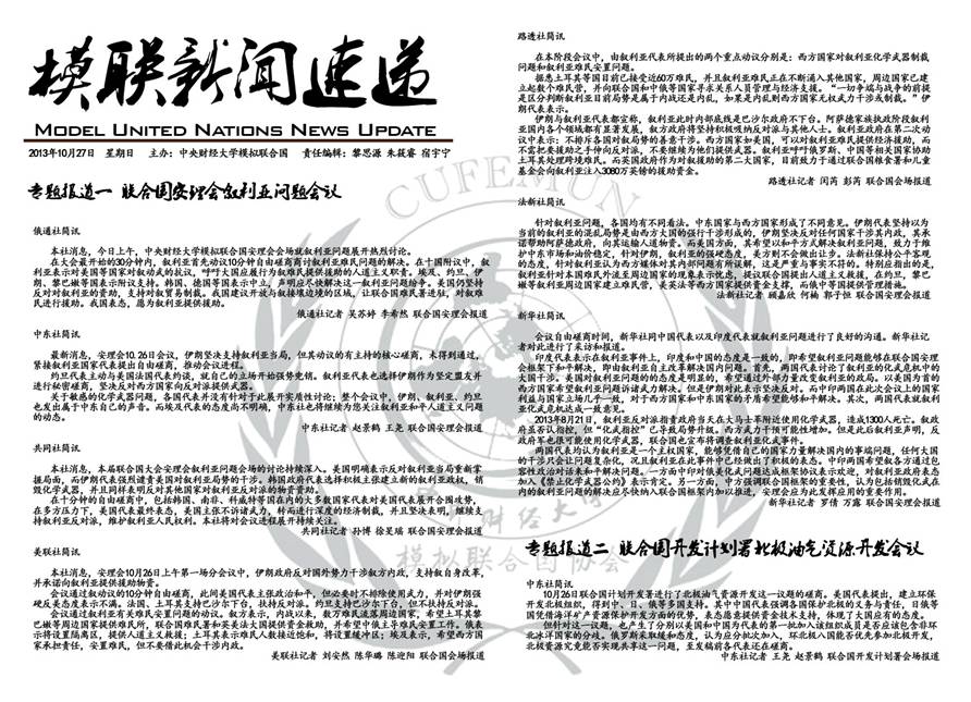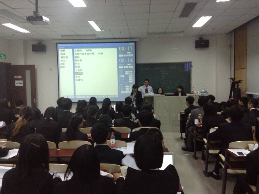 10月26、27日,模拟联合国各委员会会议正式召开。本次大会议题紧紧围绕当下国际热点,选取了包括叙利亚问题、北极油气资源开发问题在内的焦点议题以及历史上两伊战争中油轮战等历史议题。各国代表分别针对这些问题在联合国安全理事会、联合国开发计划署、历史安理会三个会场争锋相对,展开激烈辩论。各国代表怀揣国家使命,竭力表明各自立场,或激辩、或磋商,努力发挥各自国家的影响力,以为本国争取到最大利益。在为期两天的三场会议中,各位代表们进行了紧张的协商和谈判,不断深化对问题的理解,积极主动探求对会议中产生问题的解决途径。