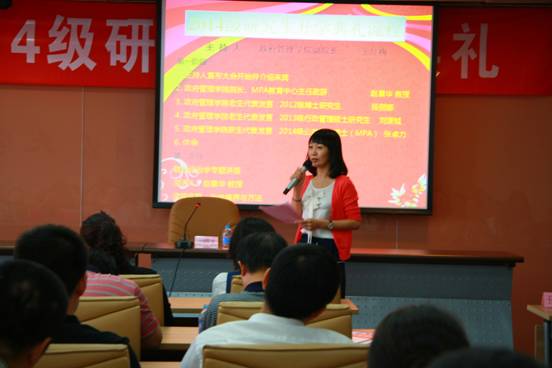 2012级博士研究生段丽娜、2013级行政管理研究生刘潇钺作为老生代表发言。作为公司第一位完成全日制MPA学业之后考取博士的研究生,段丽娜从自身考取博士和在此期间竞聘上北京市财政局副处级领导岗位的经历谈起,号召同学们在未来两年的学习中要登高望远,在学习中不断提升自己的境界;要做到学以精专,学以致用,理论与实践相结合,更重要的是要勿忘初心,这样方得始终。刘潇钺鼓励新同学在政管这个温馨的大家庭中要注重思考,端正态度,培养兴趣,增强能力,共同为自我发展和公司建设而努力。2014级公共管理硕士(MPA)张卓力同学作为新生代表发言,他表示,通过复习考试,重拾书本,他得到了之前难以想象的收获。他号召大家,要珍惜未来宝贵的两年时光,摆正姿态,潜心为学,最大限度地吸取知识和营养,为未来的发展奠定更加牢固的基础。