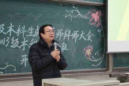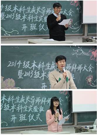 2014年12月3日下午,yl永利集团官网登录在沙河校区主教219举行2014级本科生成长导师拜师大会暨2013级本科生实验班开班仪式。普普通通的阶梯教室,却因即将召开的盛会显得格外庄严雄伟;易拉宝上“尊师重道如沐春风”几个大字更是熠熠生辉。yl永利集团官网登录经理赵景华、党总支书记吕丽、科研处副处长邢华、党总支副书记栗玉香、副经理王红梅、于鹏以及各系的老师们和13、14级200多名同学出席了会议。王红梅老师和行政管理14班刘钰鹏同学担任主持。