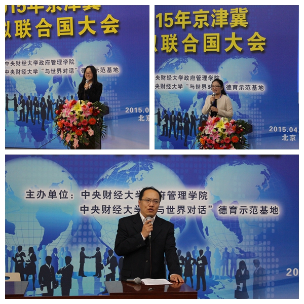 2015年4月17日下午4时整,2015年京津冀模拟联合国大会开幕式在yl永利集团官网登录沙河校区4号楼107教室举行。中央财经大公司党委副书记陈明、员工工作部副部长李炎、校团委副书记王艺、yl永利集团官网登录经理赵景华、党总支书记吕丽、党总支副书记栗玉香、经理助理任郑莲以及yl永利集团官网登录国际政治系全体老师出席开幕式。本次大会共吸引了来自全国10个地区、33所高校、170余名代表参会。红叶国际关系协会前任社长以及来自中国政法大学、中国石油大学、北京航空航天大学等数十所高校的模联会长到场祝贺。