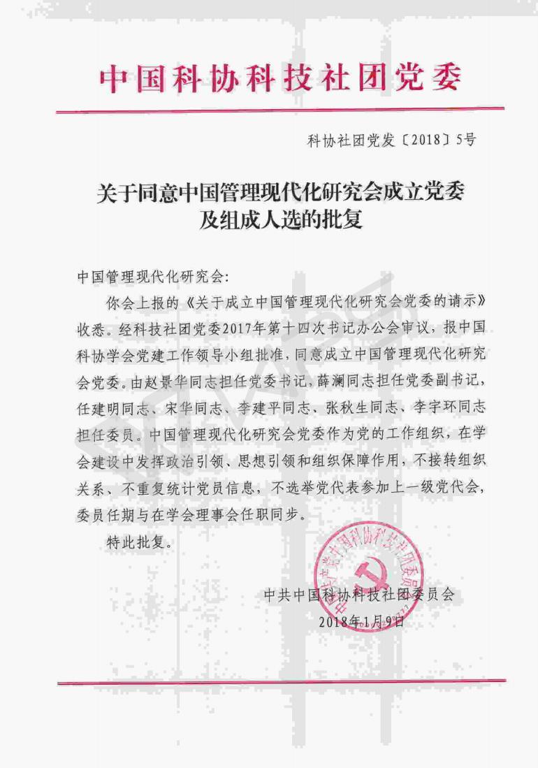 为贯彻落实党的十九大精神,进一步加强学会党建工作,经中国科协科技社团党委2017年第十四次书记办公会审议,报中国科协学会党建工作领导小组批准,科协社团党发〔2018〕5号文《关于同意中国管理现代化研究会成立党委及组成人选的批复》同意成立中国管理现代化研究会党委,党委委员由7人组成,公司经理、中国管理现代化研究会副理事长兼秘书长赵景华教授担任学会党委书记,党委办公室设在yl永利集团官网登录。