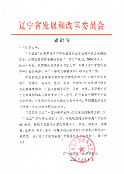近日,辽宁省发展和改革委员会向公司发来感谢信,对公司yl永利集团官网登录负责完成的《辽宁省国民经济和社会发展第十四个五年规划纲要编制》的项目研究工作表示感谢。