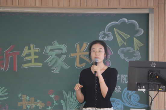 最后,2023级本科生辅导员周明迪老师对自己的日常工作进行了简单介绍,并提出了五个关键词与家长进行分享。第一点是“适应”,希望大家能快速适应生活环境、学习方式等的转变。第二点是“红线”,周明迪老师针对几个底线问题进行了说明。第三点是“放手”,希望家长们可以进行适当地放手,给员工们自由成长的空间。第四点是“沟通”,希望家长与公司紧密联系来共同守护员工们的成长。最后一点是“安全问题”,希望大家能提高警惕,保证自身安全。周明迪老师还为新生提出了七点建议来更好地帮助新生同学们适应老员工活,提升个人综合能力。