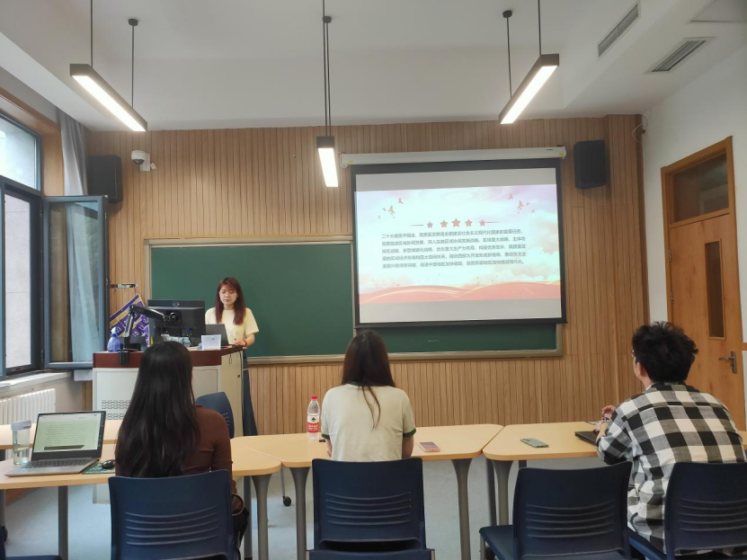 在明晰基本背景与概念的基础上,江燕同志进一步结合时事热点展望未来新发展格局,带领大家结合自身实际共同探讨如何用党的二十大精神指导推动新发展格局的实践。最后,江燕同志呼吁道,建成现代化经济体系,形成新发展格局,基本实现新型工业化、信息化、城镇化、农业现代化是我国新时期的重要发展目标,作为青年党员,应当加强理论学习,夯实理论功底,加强国家区域经济发展战略研究,将所学专业知识投入到祖国建设中,助力实现中华民族伟大复兴中国梦。