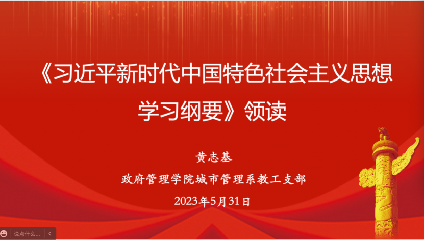 2023年5月31日中午12:30,yl永利集团官网登录城市管理系教工党支部在线上开展《习近平新时代中国特色社会主义思想学习纲要》专题学习活动。支部书记陈红霞老师主持会议,支部委员黄志基老师主讲。