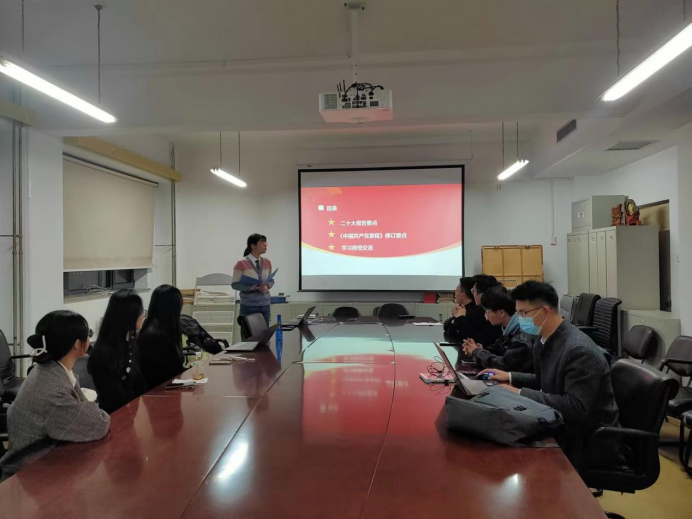 会议由党支部书记江燕主持,主要学习党的二十大报告重要内容与党章修订要点。江燕同志首先明确党的二十大的主题是高举中国特色社会主义伟大旗帜,全面贯彻新时代中国特色社会主义思想,弘扬伟大建党精神,自信自强、守正创新,踔厉奋发、勇毅前行,为全面建设社会主义现代化国家、全面推进中华民族伟大复兴而团结奋斗。然后在明晰二十大整体框架的基础上,江燕同志详细讲解党的二十大报告中三件大事、中心任务、五个重大原则等12个重点内容,并带领大家认真研读党的二十大报告原文,原汁原味地学习会议精神,引导支部党员准确领会把握党的二十大精神的思想精髓、核心要义。《中国共产党章程(修正案)》体现了党的十九大以来党的理论创新、实践创新、制度创新成果,体现了党的二十大报告确定的重要思想、重要观点、重大战略、重大举措。江燕同志进一步为大家剖析党章修订的各项要点,对新党章的性质、纲领、指导思想、基本路线等方面进行了全面深入的阐释,带领大家共同探讨新党章的新要求、新亮点等。